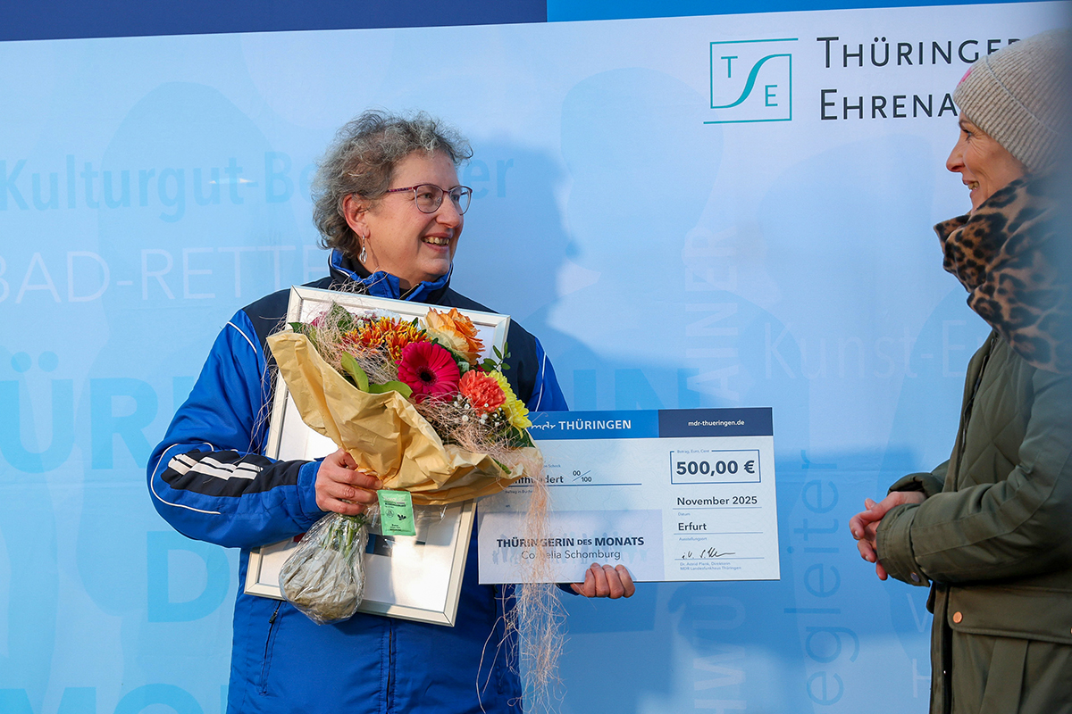 Ihre Vereinskameradin Claudia Beugel hatte mit ihrem Vorschlag an den MDR und die Thüringer Ehrenamtsstiftung dafür gesorgt, Cornelia Schomburg als "Thüringerin des Monats" auszuzeichnen.